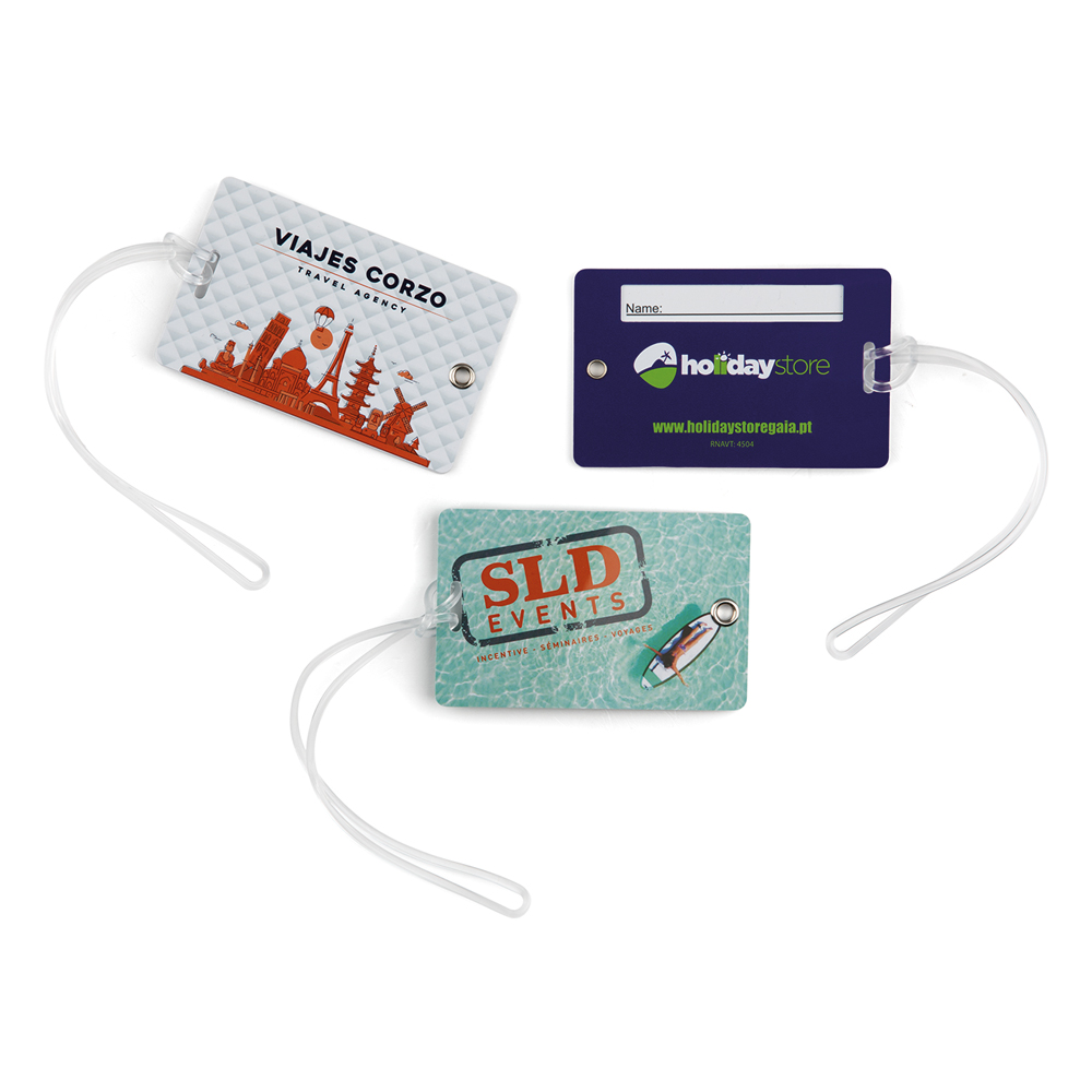 Etiqueta para maleta de PVC rígido. Contiene dos tarjetas impresas en las dos caras a todo color. Incluye una tira de plástico para sujetarla en la maleta y se presentan embolsadas individualmente.