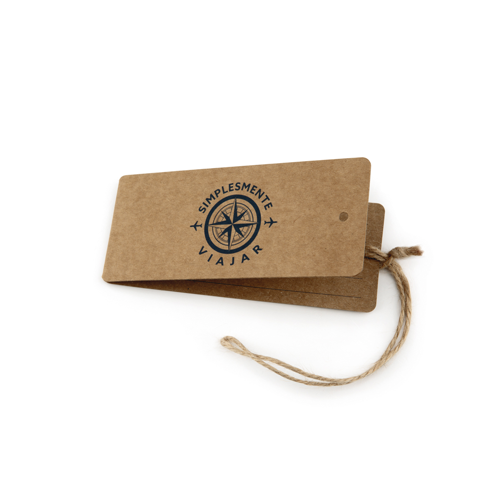 Etiqueta de equipaje de hoja doble, fabricada completamente en cartón 100% ecológico. Se personaliza 100% a un color, teniendo infinidad de posibilidades de diseño. A parte se entrega un cordón para poder sujetar la etiqueta en el equipaje.
