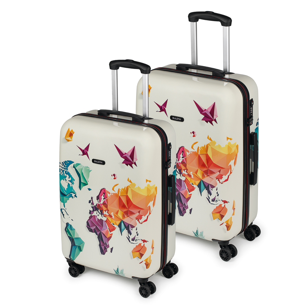 Set de dos maletas fabricadas en ABS, con 8 ruedas giratorias 360º para una mayor movilidad, lo que hace más fácil su manejo. Cerradura TSA internacional. Diseño novedoso y moderno de mapa con efecto tridimensional y personalización discreta con el logotipo del cliente. Tiene asa superior y lateral para poder desplazarse cómodamente.