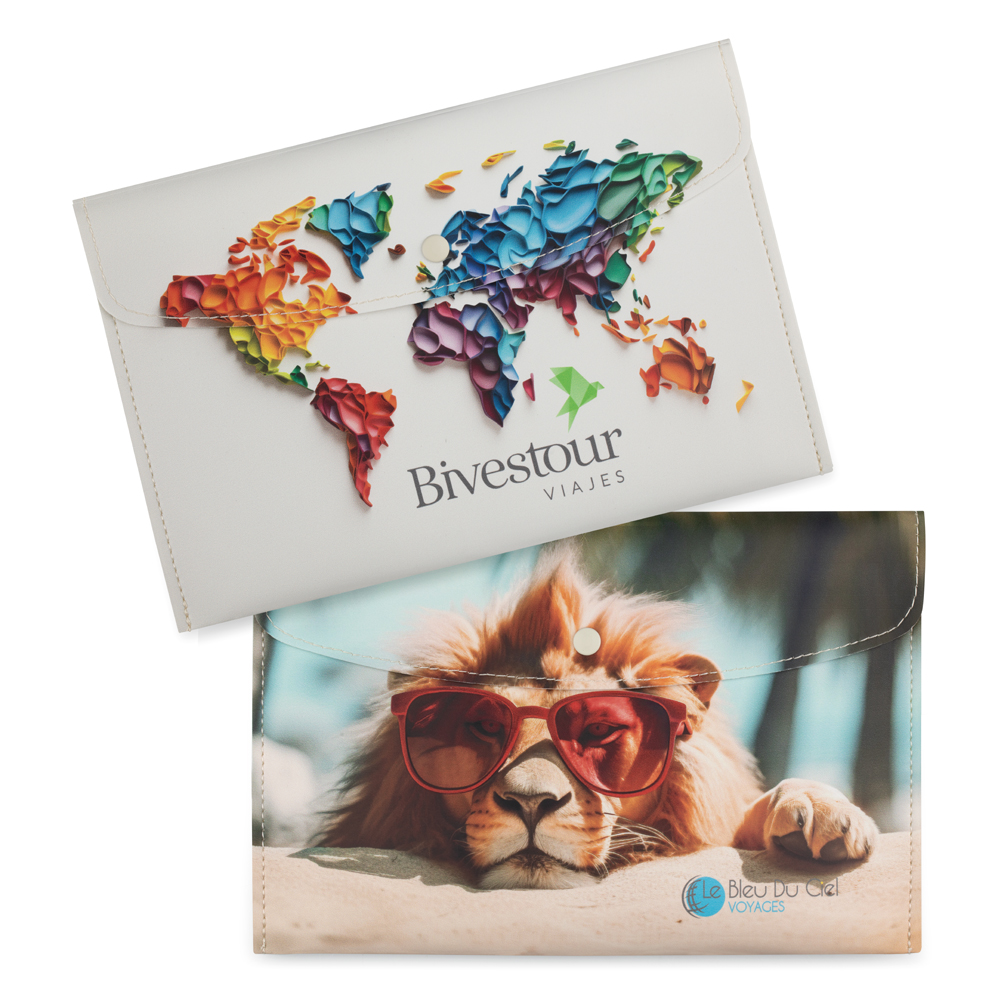 Portadocumentos fabricado en polipiel con diseño totalmente personalizado, ideal para billetes de avión y guías turísticas. Añada el diseño, logotipo, marca o dibujo de fondo totalmente a su gusto.
