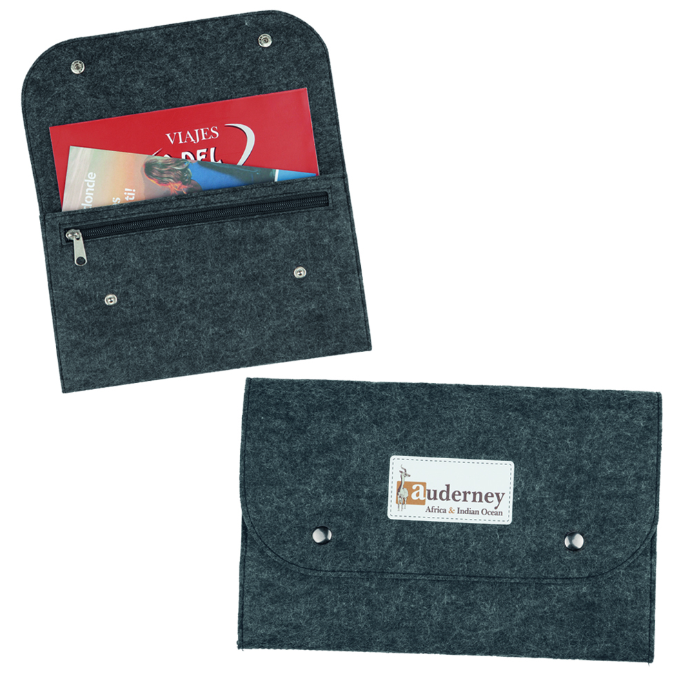 Portadocumentos fabricado en fieltro, material 100% ecológico. Cierre de broches y dos departamentos internos de gran capacidad, uno de ellos con cierre de cremallera. Ideal para sus billetes de avión. Tamaño de doblado A5. Se puede personalizar en bordado o utilizando un anagrama impreso a varios colores.