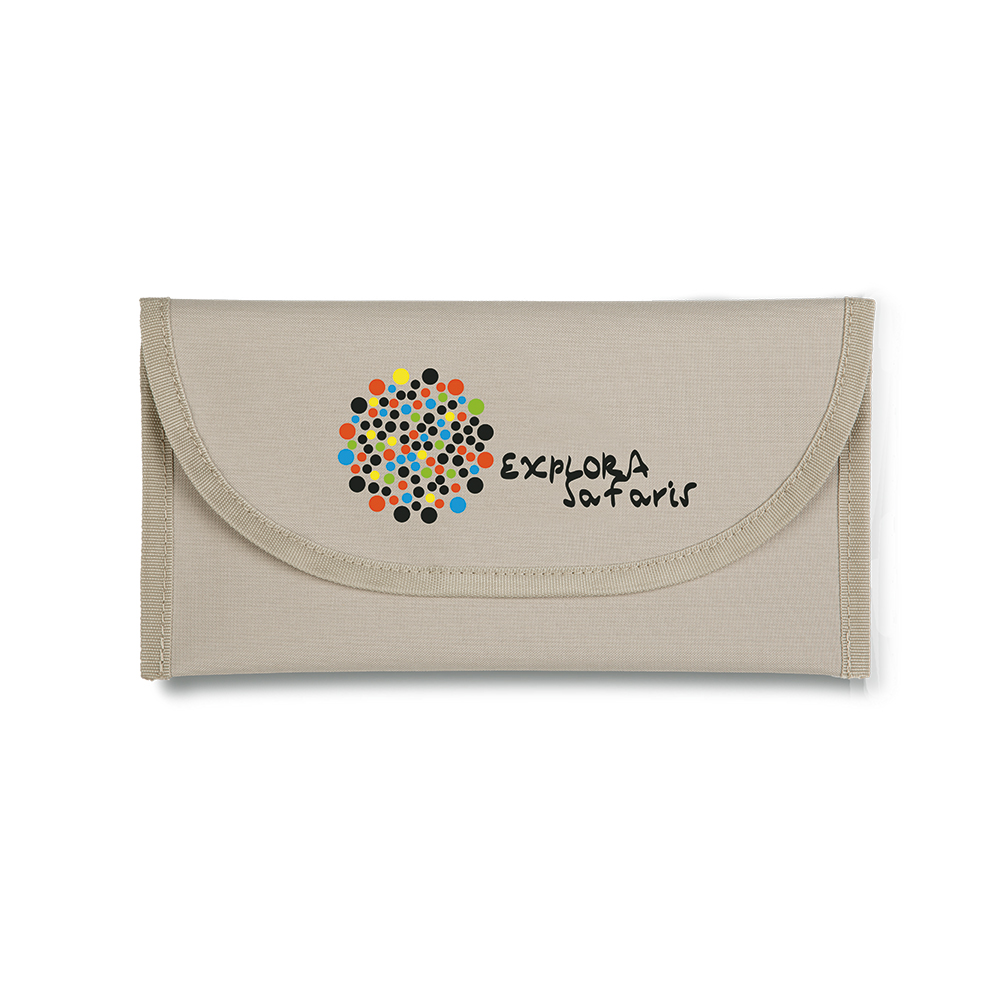 Portadocumentos sencillo fabricado en nylon, con un separador interior y cierre de velcro. Su personalización puede ser en bordado como en anagrama impreso a todo color. Color beige, 2 departamentos y cierre de velcro.