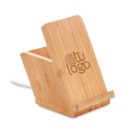 Porta bolígrafos hecho con bambú, que contiene cargador inalámbrico de doble bobina para 1 dispositivo móvil, además de soporte para el mismo. Salida: DC5V/1A (5W). Artículo compatible con los últimos modelos Android, iPhone® 8, X y más recientes.