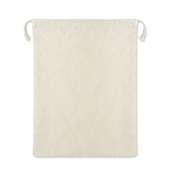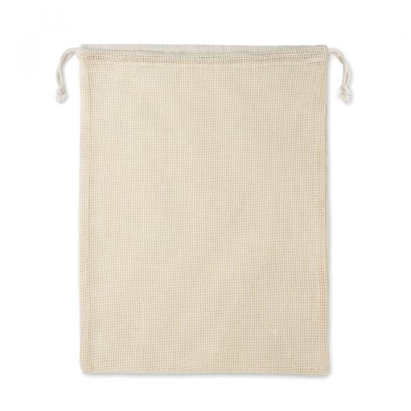 Bolsa con rejilla para guardar alimentos. Está compuesta por una cara de algodón de 140gr/m2 y otra care de rejilla perforada de 110gr/m2. Disponible en color algodón natural y tiene un cordón superior para cerrar y agarrar la bolsa.