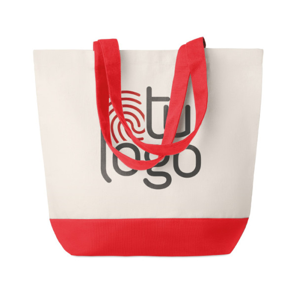 Bolsa de la compra fabricada en algodón de 280gr/m2 de gran calidad. Está disponible en dos versiones diferentes, negra o roja. Tienes dos asas de tamaño grande para colgar del hombro.