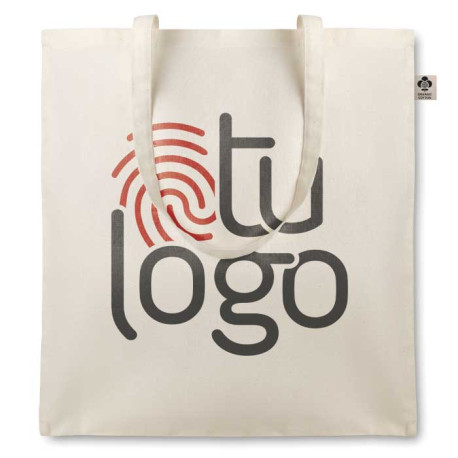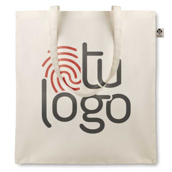 Bolsa de la compra fabricada en algodón orgánico de 105gr/m2. Tiene dos asas largas para colgar tanto de la mano como del hombro.