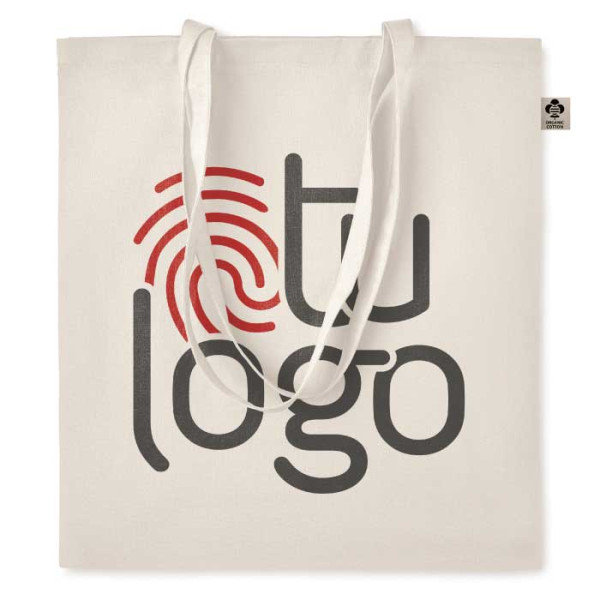 Bolsa de la compra de asas largas fabricada 100% en algodón orgánico. Tiene una calidad de 140gr/m2 y tiene la etiqueta certificada de algodón orgánico incorporada.