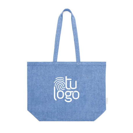 Bolsa ecológica fabricada en algodón reciclado de 140g/m², con asas largas reforzadas (70 x 2,5 cm) y fuelle en la base para mayor capacidad. Disponible en colores natural y negro, con distintivo de algodón reciclado en la etiqueta exterior. Resistencia de hasta 6 kg de peso. Ideal para personalizar con tu logotipo y potenciar la visibilidad de tu marca.
