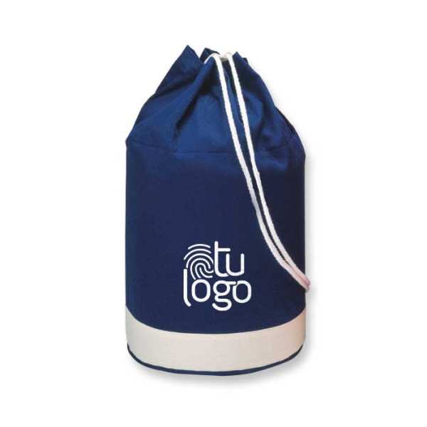 Bolsón o macuto fabricado en algodón 200gr/m2 en color azul marino. Tiene un tamaño idóneo para guardar varios objetos en el interior. Será un regalo promocional único debido a que se puede personalizar con diferentes tipos de marcaje a todo color en diferentes sitios del macuto.