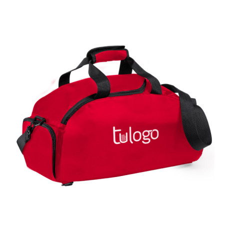 Bolso/mochila deportivo fabricado en resistente nylon 420D. Incluye compartimento independiente para calzado, bolsillo lateral con cremallera, y compartimento principal con doble tirador. Asas reforzadas con cierre de velcro, y cintas acolchadas y ajustables. Ideal para personalizar con tu logo.
