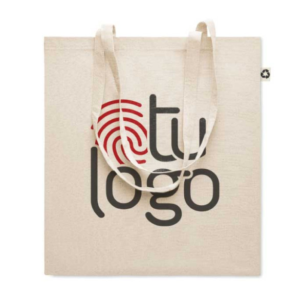 Bolsa de la compra de algodón reciclado postconsumo (65% algodón reciclado, 35% algodón normal) con asas largas. 140 gr/m².