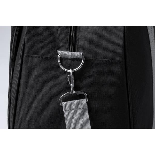 Bolso de viaje de gran capacidad fabricado en resistente RPET 600D. Incluye doble asa con cierre de velcro, asa ajustable y un bolsillo frontal con cremallera. Disponible en varios colores y presentado en una bolsa individual reciclada. Ideal para personalizar con tu logo y destacar tu compromiso con la sostenibilidad.