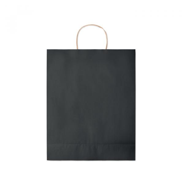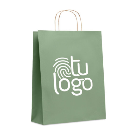 Bolsa de papel de tamaño mediano para personalizar. Está compuesta en un 70% de papel reciclado y fabricada en Europa. Disponible en diferentes colores para convertirla en una bolsa más llamativa. Tiene un tamaño de 32 x 12 x 40cm.