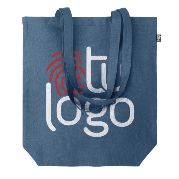 Bolsa de la compra fabricada 100% por un tejido de cáñamo de gran resistencia de 200gr/m2. Tiene dos asas largas para utilizar tanto en la mano como en el brazo. Disponible en varios colores, totalmente personalizable.