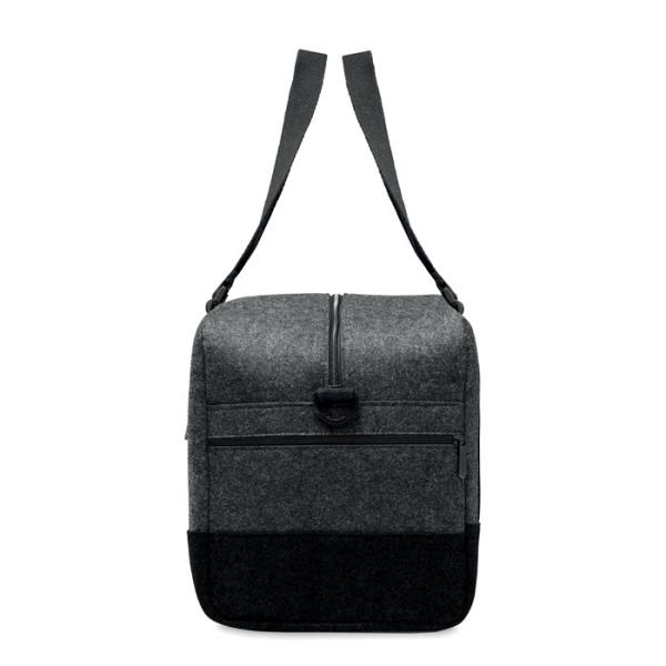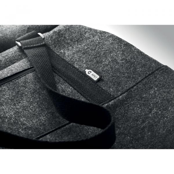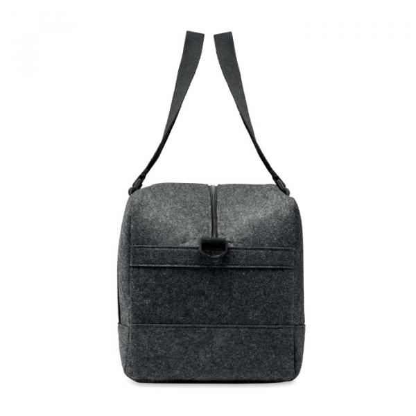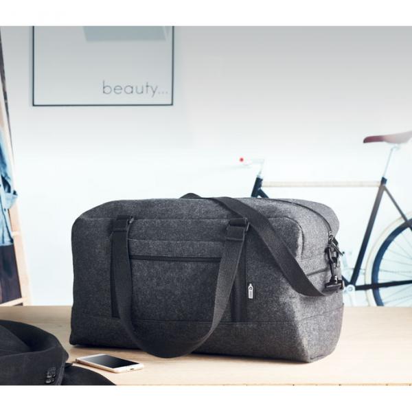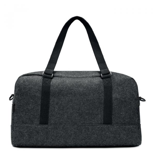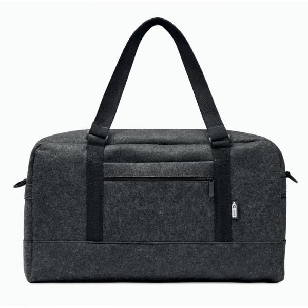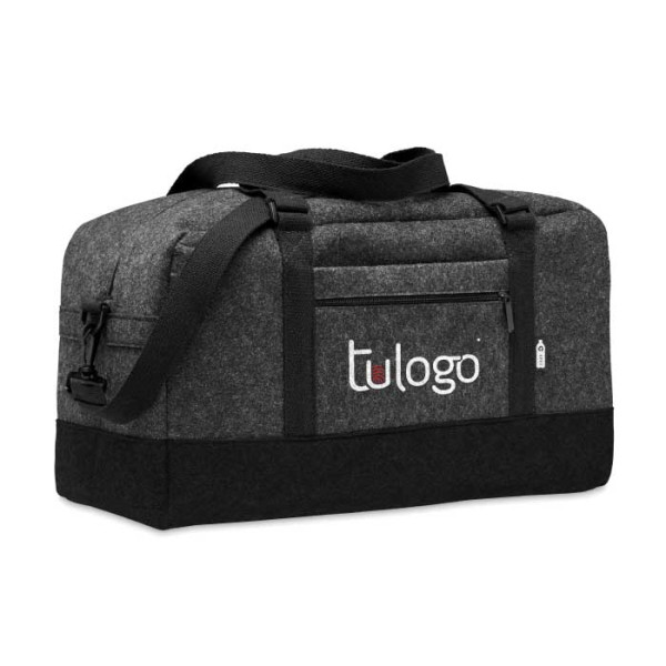 Bolsa de viaje o equipaje de mano fabricado en fieltro reciclado RPET. Tiene un bolso principal de gran capacidad y un bolsillo frontal con cremallera. Las asas son de algodón y tiene una bandolera ajustable que se puede desmontar.