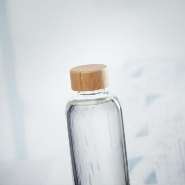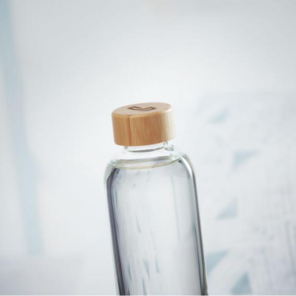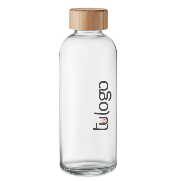 Botella de cristal personalizada con tapa de bambú y capacidad de 650 ml. Disponible en color transparente con cierre hermético antifugas. Haz presente tu marca en el día a día de tus clientes.