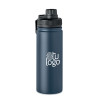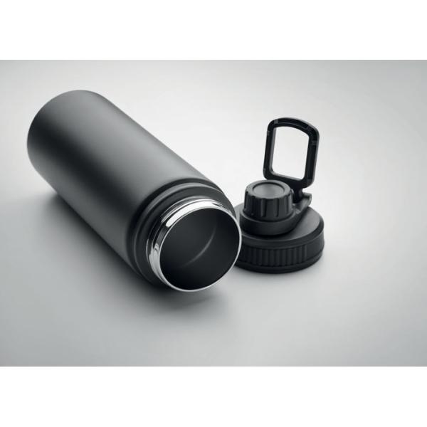 Botella personalizable fabricada en acero inoxidable que incluye un tapón de plástico para beber y un asa que facilita su transporte. Dispone de una doble pared aislada al vacío que permite guardar perfectamente su contenido. Tiene una capacidad máxima de 500 ml.