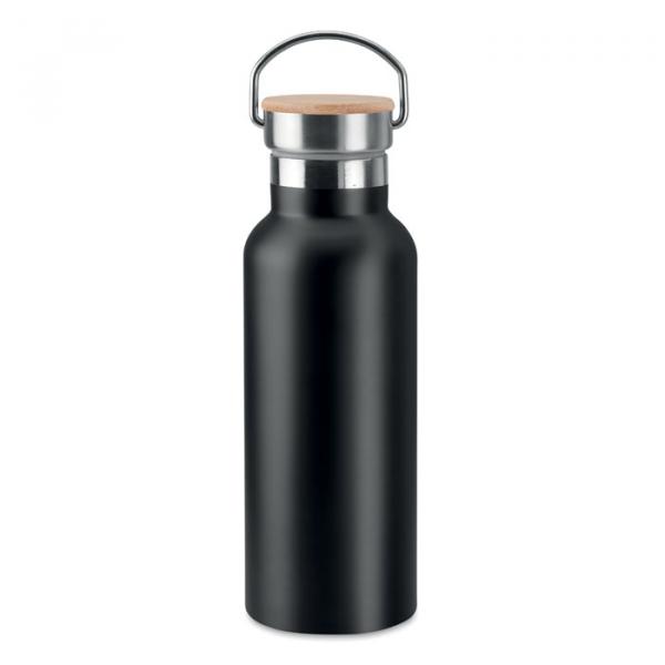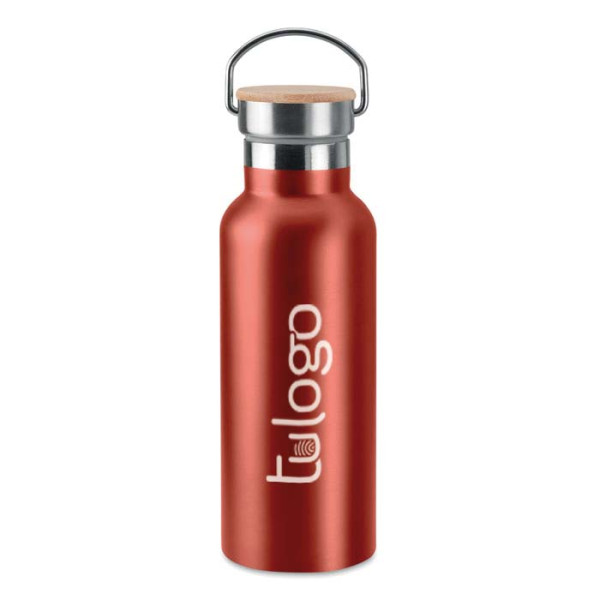 Esta botella de doble pared, efecto termo, ha sido fabricada de acero inoxidable e incluye una tapa de bambú y un asa metálica plegable. Se denomina efecto termo debido a que tiene una constitución de dos capas de aluminio con espacio entre ellas para aislar al máximo la temperatura. Ofrece una capacidad interna de 500ml y tiene un cierre hermético antifugas. Embalaje individual en caja de cartón blanca.