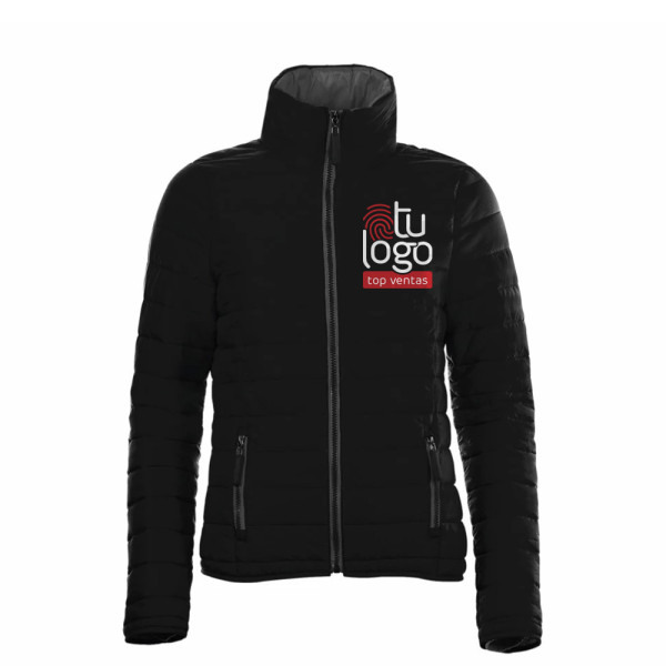 Chaqueta mujer 180g/m² con corte ajustado que realza la figura. Forro y cremallera en contraste agregan un toque moderno. Forro 100% nylon y relleno 100% poliéster , aseguran calidad y calidez. 2 bolsillos con cremallera y cuello alto que brinda protección.