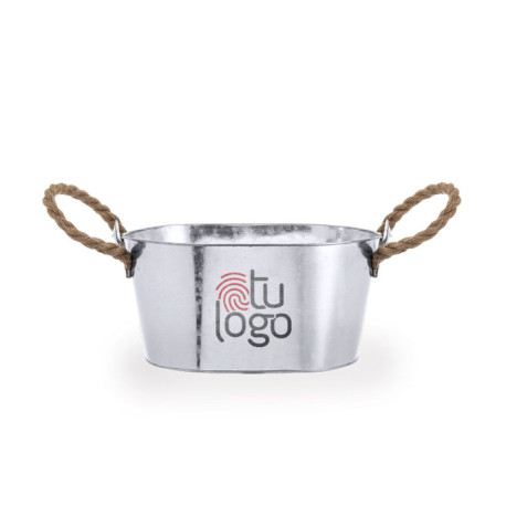 Cubo de metal con capacidad de 6 litros, incluye abridores fijos en los laterales y asas de cuerda. Ideal para mantener bebidas frías en eventos, terrazas o promociones de verano. Personalizable y con diseño robusto y funcional.