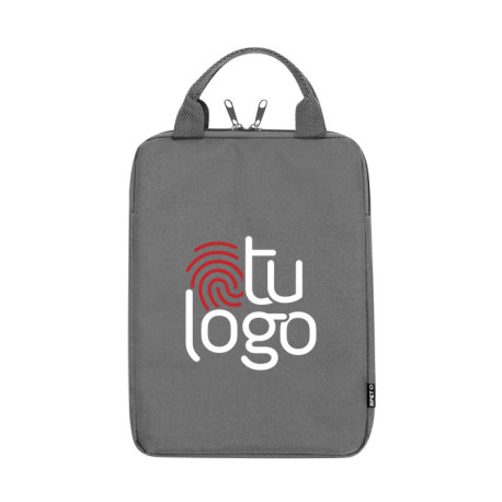 Funda Copenhague para tablet de hasta 10", fabricada en RPET 600D reciclado, con cierre de cremallera, asas de transporte y tiradores metálicos.