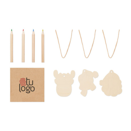 Set de 3 adornos navideños de madera con 4 lápices de colores, la opción creativa perfecta para las festividades. Presentado en una elegante caja Kraft, este set es un regalo encantador para tus clientes en esta Navidad.