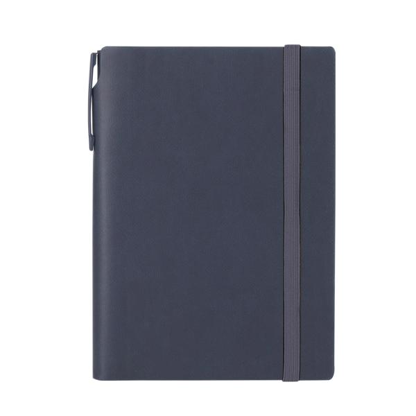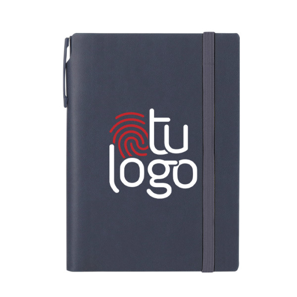 Set de libreta y bolígrafo fabricados en PU reciclado y aluminio reciclado. Incluye bloc con 96 páginas crema, cierre elástico y espacio integrado para el bolígrafo. Ideal para regalos corporativos sostenibles y uso profesional diario.