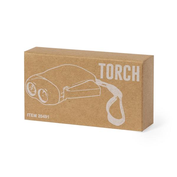 Linterna auto-recargable con 2 LEDs y sistema de carga manual por dinamo. Diseño eco-amigable en negro y gris, con cinta de transporte incluida. Presentada en caja kraft. Ideal para personalizar con tu logo como regalo promocional sostenible.