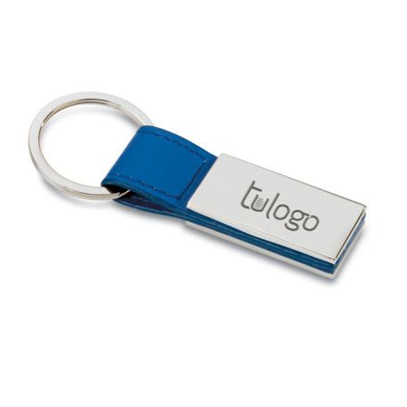 Llavero rectangular con base de metal, tira de cuero en negro o azul y anilla metálica. Presentado en caja de regalo, es un regalo clásico y práctico para tus clientes.