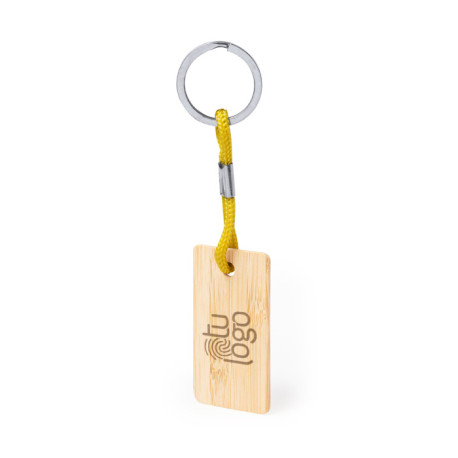 Llavero rectangular fabricado en bambú, con cordón disponible en variados colores. Ideal para personalización mediante marcaje láser. Fomenta el uso de materias primas naturales y sostenibles.