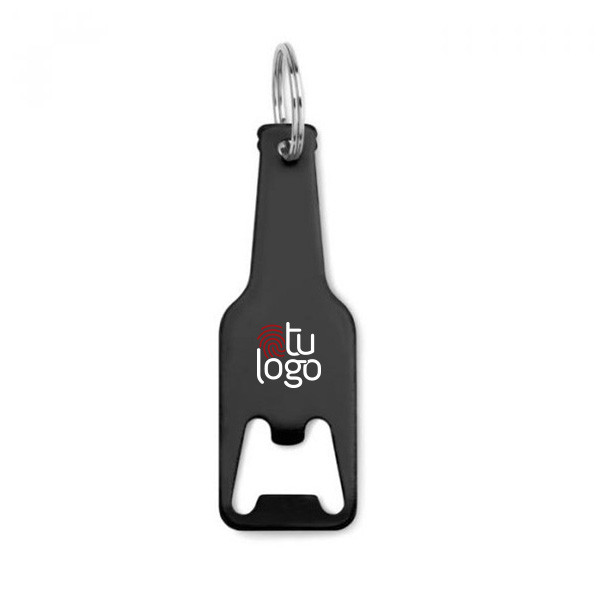 Llavero con forma de botella hecho de aluminio. En la parte inferior de la botella hay un hueco que sirve para utilizarlo como abridor. En el cuello de la botella tiene un agujero por el que pasa la anilla del llavero. Este producto está disponible en color negro, azul, rojo o gris.