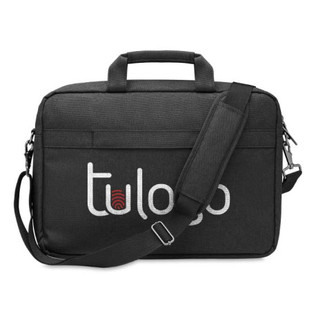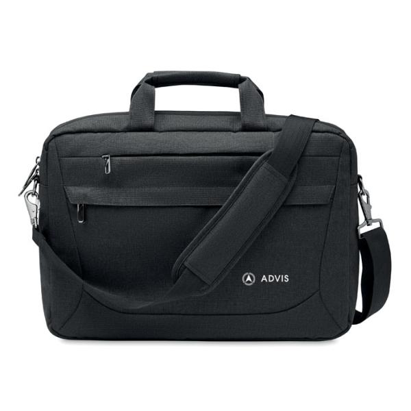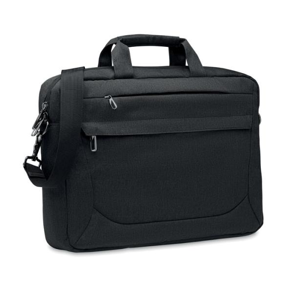 Maletín para portátil de 15'' en poliéster RPET 600D. 2 compartimentos principales internos para portátil y tablet, gran bolsillo frontal con cremallera, y pequeño bolsillo adicional. Tirantes desmontables y ajustables, con soporte para trolley en el reverso.