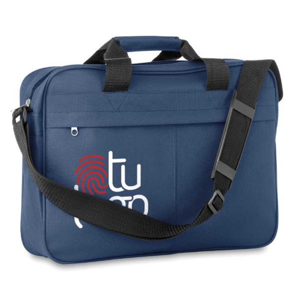 Maletín porta documentos en nylon 600D con capacidad para portátil de hasta 15''. Bolsillo frontal con cremallera para accesorios. Asas en la parte superior y bandolera ajustable para transporte cómodo. Personaliza con tu logo para un estilo empresarial distintivo.