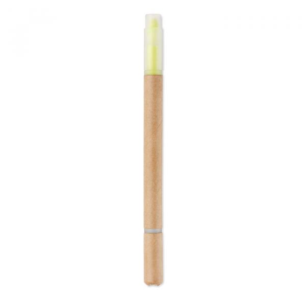 Bolígrafo y subrayador 2 en 1 con colores de tinta azul y amarillo. Hecho con cartón y punta de plástico, las aperturas son con tapón.
