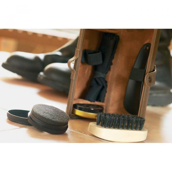 Set de 5 piezas para limpieza de calzado en elegante estuche regalo. Incluye paño negro, calzador, cepillo de madera, esponja y abrillantador neutro. Renueva y protege tus zapatos con este completo kit. Perfecto para mantener tu calzado impecable.