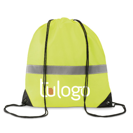 Mochila de cuerdas en nylon 190D con banda reflectante para mayor visibilidad. Cierre de cordón ajustable. Ligera y llamativa, ideal para personalizar con el logo de tu empresa. Ofrece seguridad y visibilidad a tus clientes.