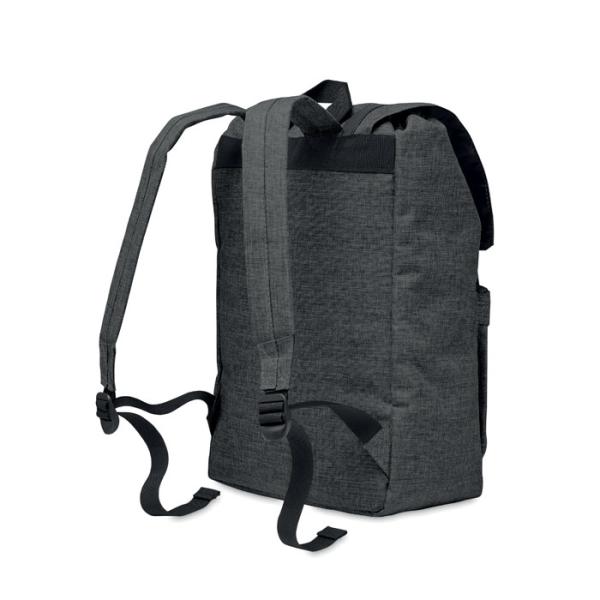 Mochila para portátil de nylon jaspeado con asas acolchadas. Cuenta con un compartimento principal para ordenador portátil de hasta 15'' y un cable de carga USB. Bolsillo frontal delantero con cremallera. Botón magnético para cierre instantáneo de la solapa.