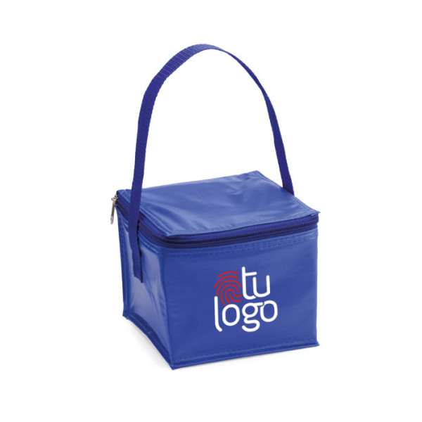 Nevera portátil para 4 latas, confeccionada en resistente PVC con isotermo de aluminio, cierre de cremallera y asa a juego. Compacta, práctica y personalizable, perfecta para eventos y merchandising.