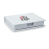 Caja de cartón que contiene 5 posits en colores fosforitos, 100 hojas lisas en color blanco y un bloc de notas amarillas adhesivas.