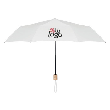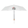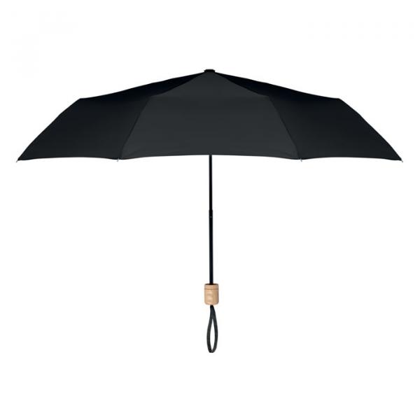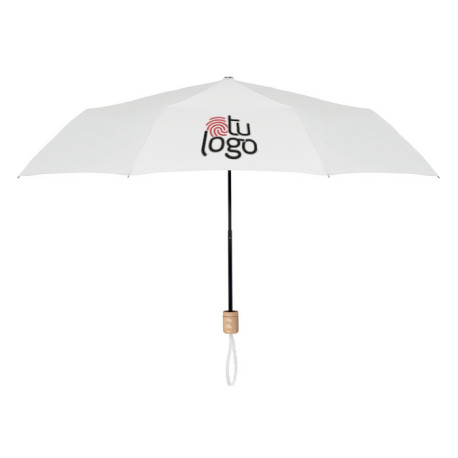Este paraguas plegable ha sido fabricado de pongee (tejido de calidad superior) RPET 190T, con marco y varillas en chapado metálico color negro y un mango de madera. Apertura y cierre manuales, tiene un tamaño de 21" e incluye una funda de pongee.