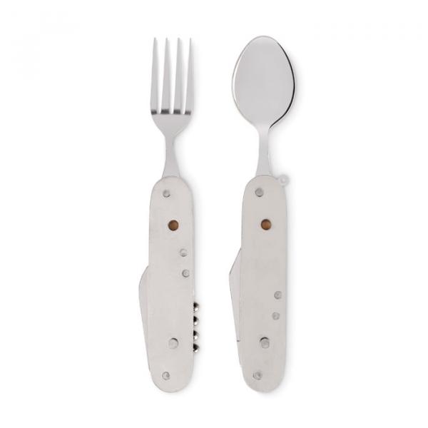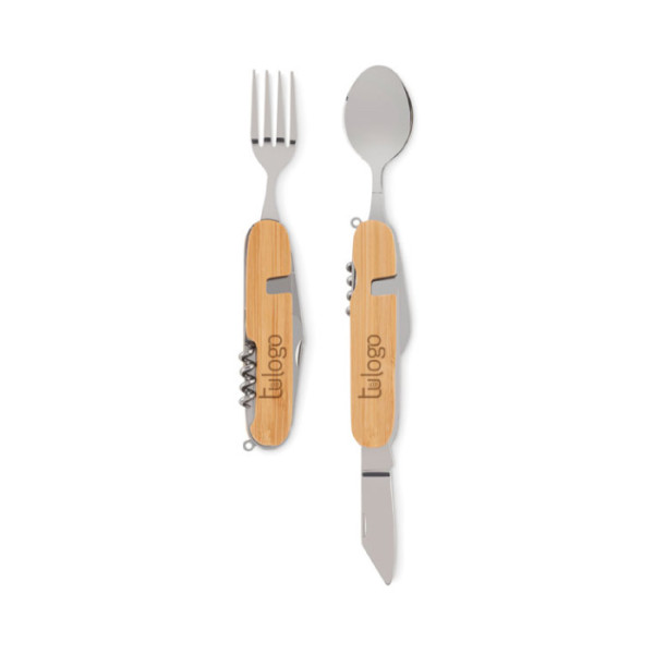Set de cubiertos metálicos plegables multifunción para camping con mango de madera. Incluye tenedor, cuchara, abrelatas, abridor de vino y cuchillo. Personalizable con tu logo.