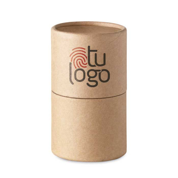 Set de 30 lápices de cera de múltiples colores presentados en una caja de cartón reciclado con forma de tubo.