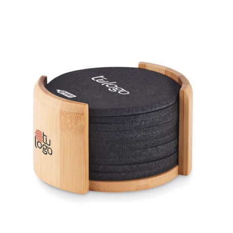 Pack de 10 posavasos personalizables de fieltro hecho en RPET, un material reciclado y ecológico. Incluye un soporte de bambú muy práctico que será de gran utilidad a la hora de guardarlos.