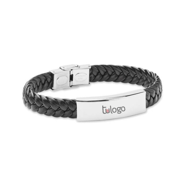 Brazalete trenzado de piel sintética con herrajes de acero pulido y cierre de presión. Circunferencia de muñeca de 21 cm. Elegante y personalizable con logo.