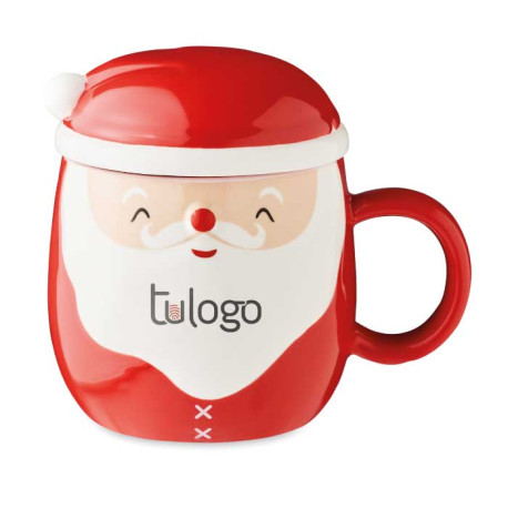 Taza con la forma de Papá Noel hecha de cerámica y con una tapa en la parte superior. Tiene una capacidad de 370 ml.