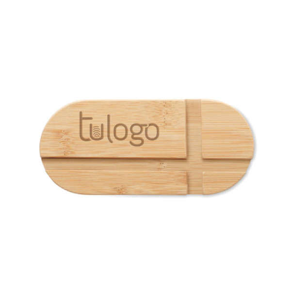 Versátil soporte de bambú para tablets y smartphones. Ideal para clientes que buscan comodidad y practicidad. Personalízalo con tu logo para ofrecer un soporte funcional y personalizado.