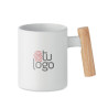 Taza de cerámica de 320 ml con asa de madera y personalización de alta calidad. El diseño resistente incluye técnicas diferenciadas: tampografía (no apta para lavavajillas) y transfer cerámico (sí apto). Presentación en caja blanca individual, ideal para merchandising o regalos corporativos.