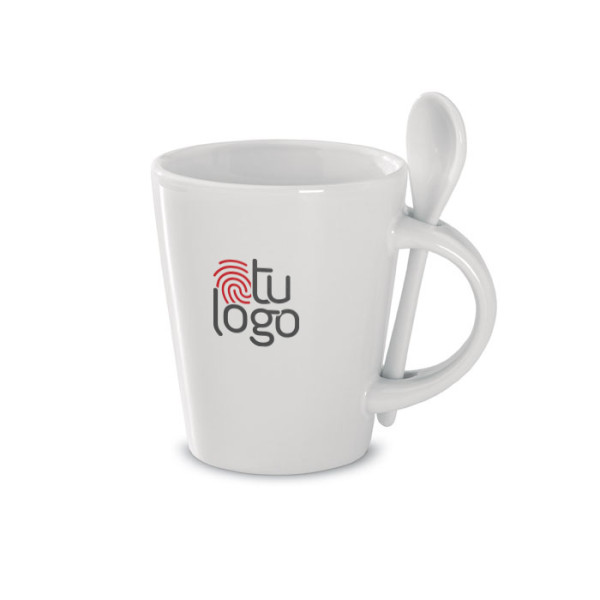 Esta taza ha sido fabricada con gres e incluye una cuchara en el mango. Ofrece una capacidad interior de 300ml. Este modelo está disponible en color blanco. Incluye embalaje con caja de cartón individual blanca.