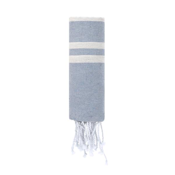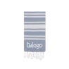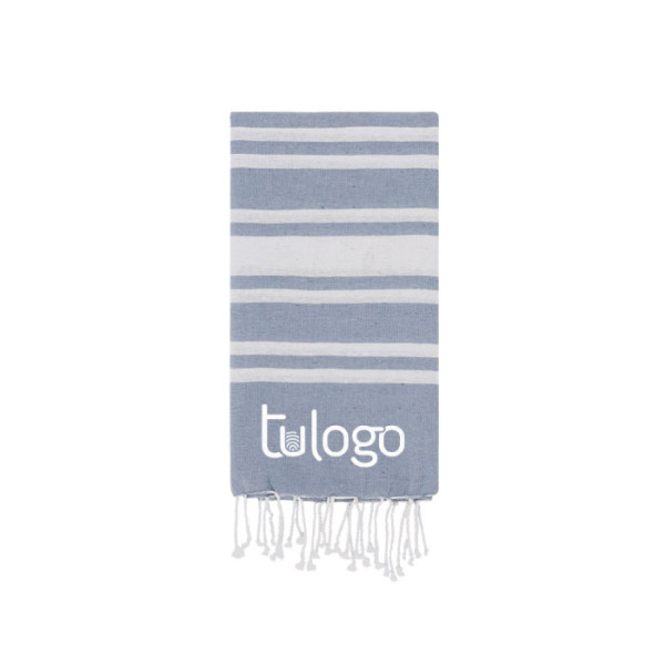 Pareo-toalla suave de 150 g/m², elaborado en mezcla de algodón y poliéster, con rayas blancas y flecos decorativos en los extremos. Ligero, absorbente y fácil de personalizar. Perfecto para merchandising estival, actividades de playa o relax corporativo.
