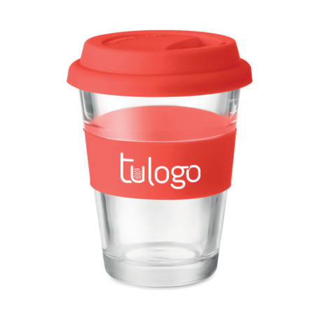 Vaso fabricado de cristal que incluye una tapa y una faja de silicona antideslizante para poder agarrarlo cómodamente sin quemaduras. Ofrece una capacidad interior de y está disponible en una amplia gama de colores.